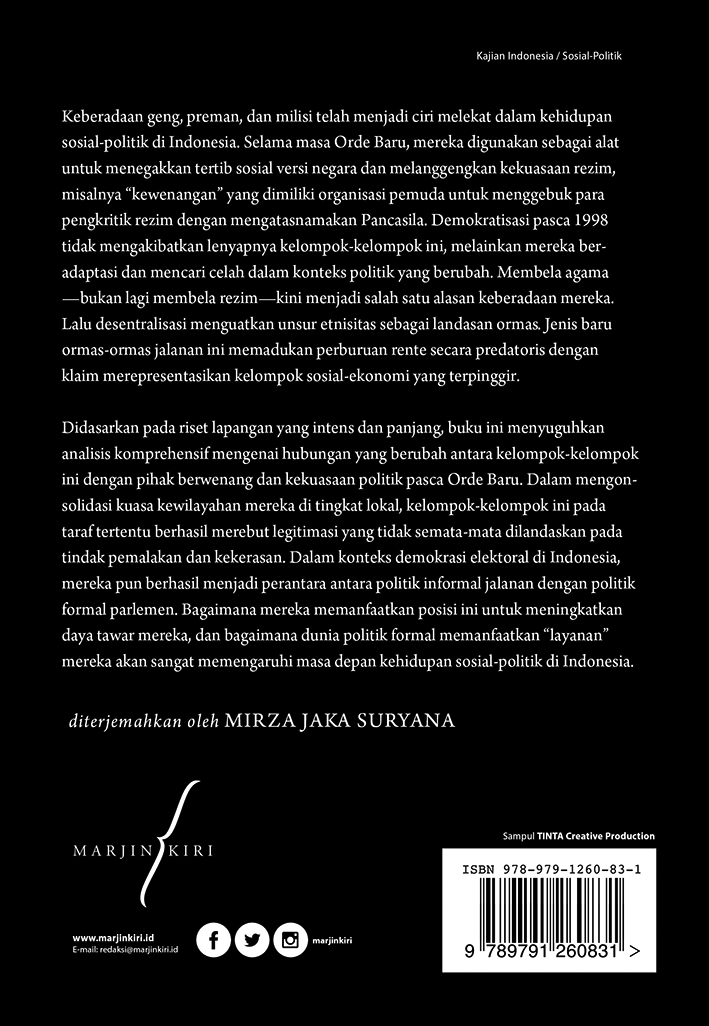 Didasarkan pada riset lapangan yang intens dan panjang, buku ini menyuguhkan analisis komprehensif mengenai hubungan yang berubah antara kelompok-kelompok ini dengan pihak berwenang dan kekuasaan politik pasca Orde Baru. Dalam mengonsolidasi kuasa kewilayahan mereka di tingkat lokal, kelompok-kelompok ini pada taraf tertentu berhasil merebut legitimasi yang tidak semata-mata dilandaskan pada tindak pemalakan dan kekerasan.